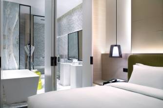 南昌梅岭新旅铂尔曼酒店位于南昌市湾里中心区域,距离红谷滩CBD商务区、南昌高铁西站、昌北机场车程30分钟,交通迅捷而便利。酒店由新旅集团投资兴建,建筑面积32000平米,是集客房、餐饮、商务会议、休闲游乐、户外拓展、文化艺术于一体的一站式城市近郊微度假酒店。 酒店背倚800亩磨盘山森林公园,紧邻岭秀湖,建筑造型呈“L”型院落式组群分布,现代中式设计风格,融汇中国园林及建筑的精髓,梁柱榫卯结构,斜屋顶空间,镂空式全落地玻璃隔断,身处室内即可欣赏庭院美景。室内地面由取自地下10米专用黏土烧制而成的金砖铺设,沿
